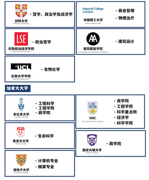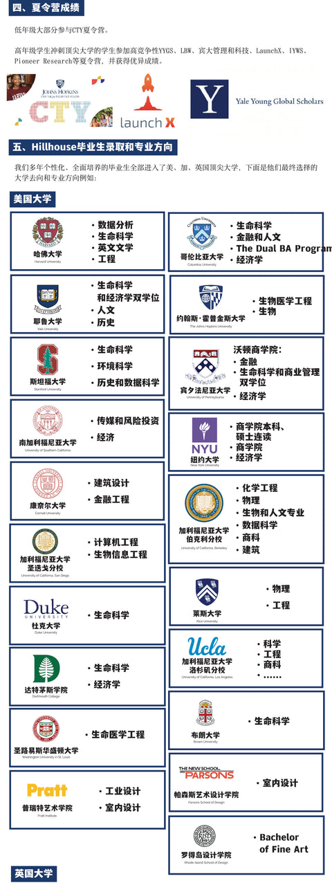 我们全面培养的毕业生最终分别进入哈佛、耶鲁、沃顿、沃顿双学位,斯坦福、纽约商学院、哥伦比亚大学、约翰霍普金斯、伯克利、UCLA、UCSD、南加州大学、康奈尔建筑、剑桥、伦敦政治经济学院、英国 AAA建筑、Pratt 室内设计、Parsons、UBC和多大的科学、工程、商学院等