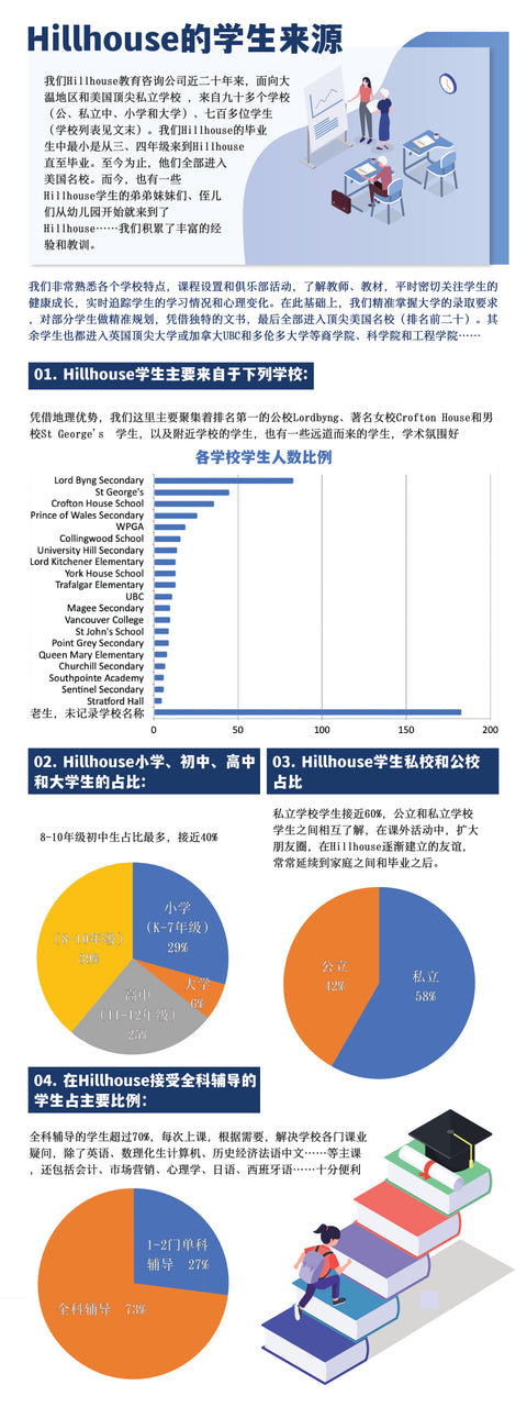 在温哥华西区 5549 Dunbar St( Dunbar 夹39街)和3479 Dunbar St(Dunbar夹19街)、有一家没有广告、隐于市井近20年的教育规划有限公司Hillhouse Education(高瓴教育咨询公司),老师们致力于在“个性、课业、运动、艺术、领导才能、义工“等全面培养学生,注重思考和写作、数学和创新能力的培养,注重文、理并茂,熟悉IB/AP/SAT/ACT/SSAT,各科竞赛并进,从小学或初中开始培养、夯实基础,韬光养晦,厚积薄发,达到高屋建瓴之境地。