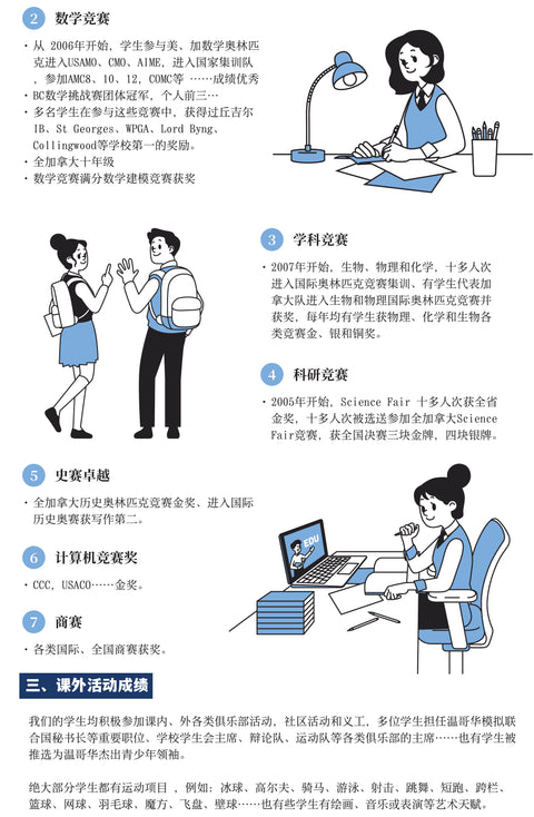 我们的学生来自于大温各地,有温哥华、西温、白石、素里和高贵林等地;还有美国和英国排名第一的私立学校的学生,例如菲利普斯安多福、薇雅公学的学生。